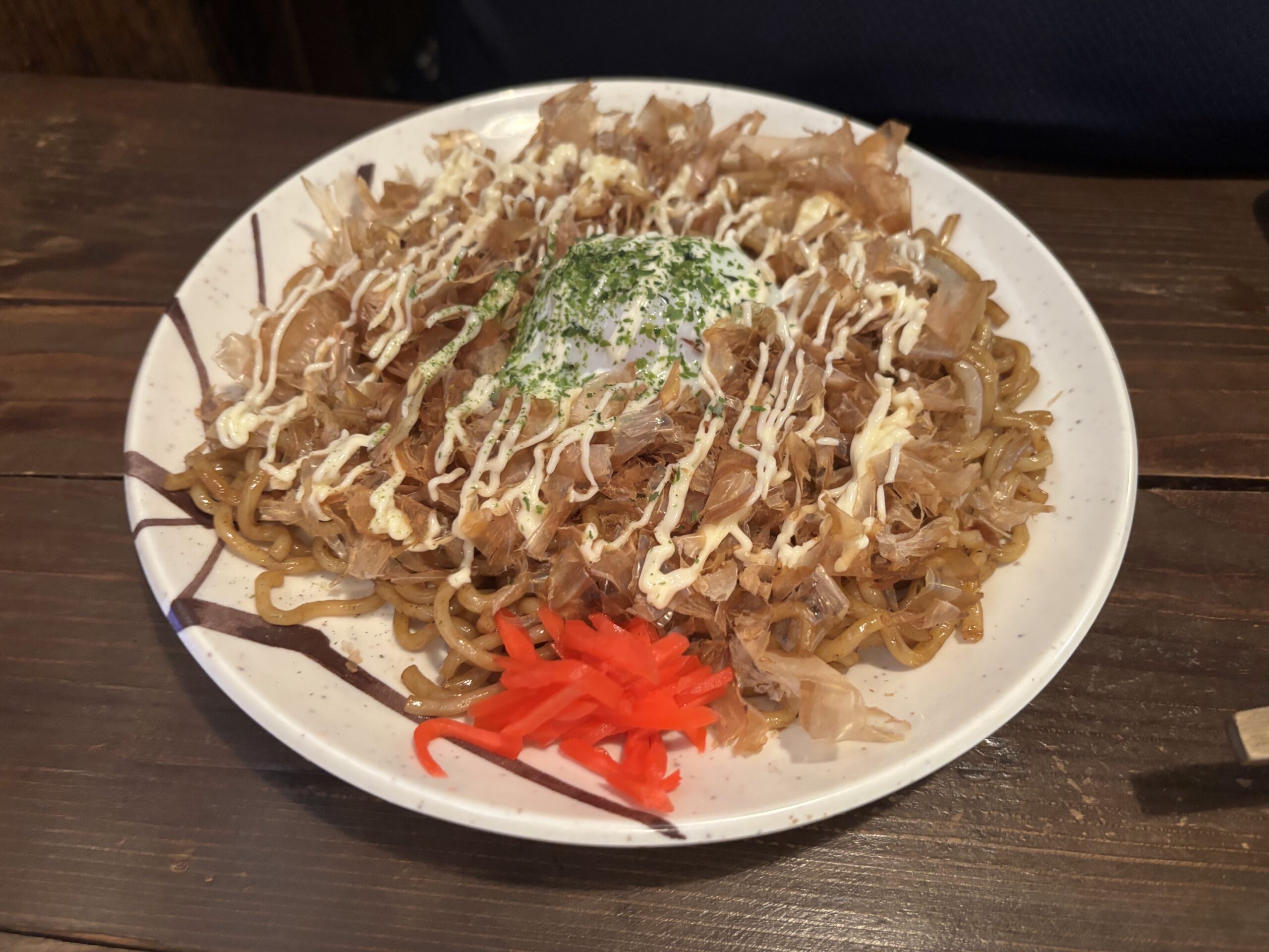 まず、お好み焼き焼きそば。目の前に来た瞬間からソースの香りがしっかり立ちのぼり、焼きそばでありながらお好み焼きのような“香ばしい屋台の匂い”が食欲を刺激します。太麺はやはりもちもちで、ソースの濃さに負けない存在感。キャベツの甘みが適度なアクセントになり、一口ごとに満足感のある味わいでした。